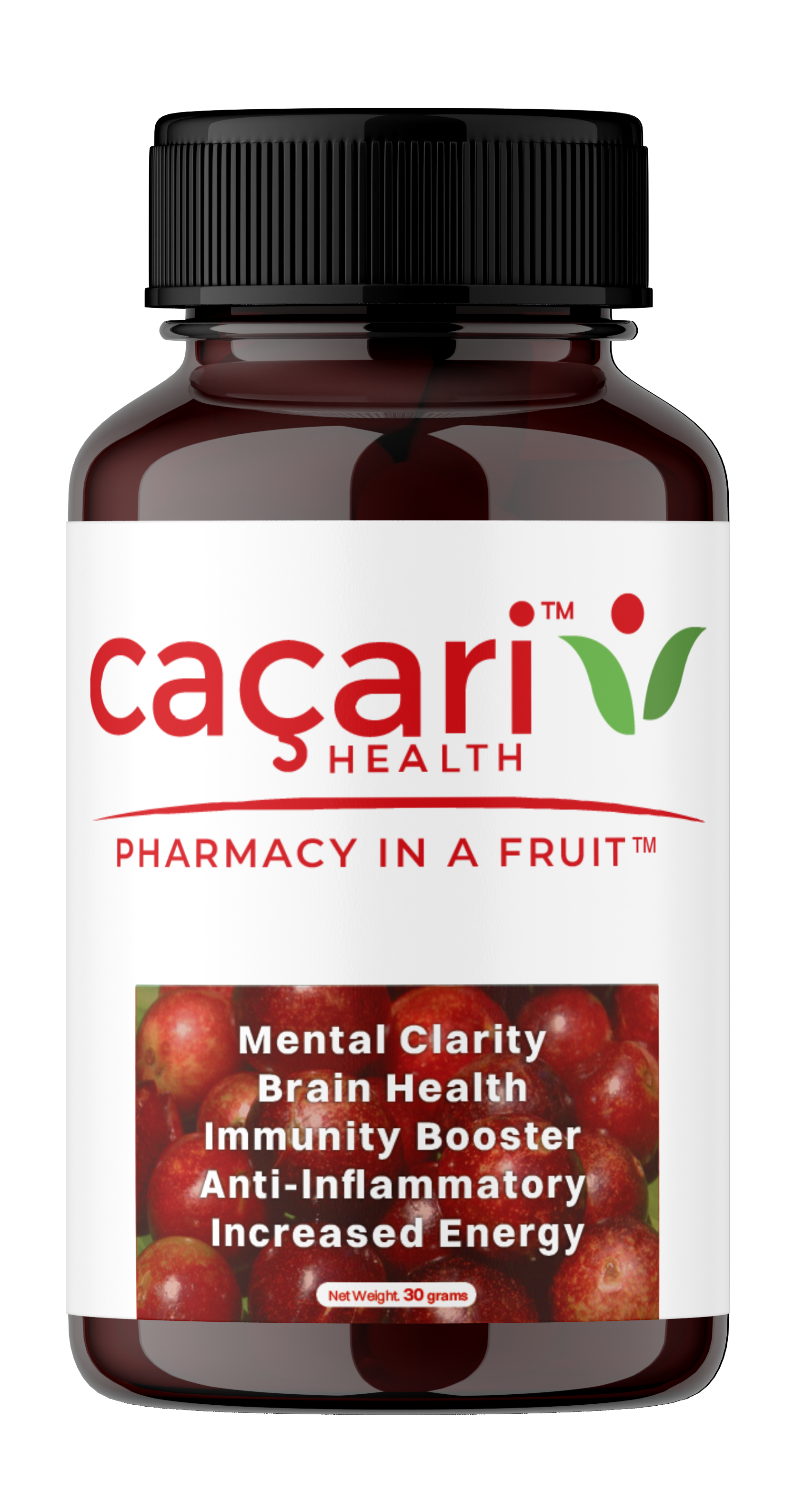 Unlock the secrets of the Amazon with Caçari Health™, the world's only patented pure whole fruit Camu extract. Cacari Health™ the Pharmacy In A Fruit™ is packed with an abundance of antioxidants, polyphenols, flavonoids, amino acids and anti-inflammatory properties, all of which contribute towards mental clarity and an anti-aging afterglow. Camu Camu contains the highest level of natural occurring Vitamin C in the entire plant kingdom.